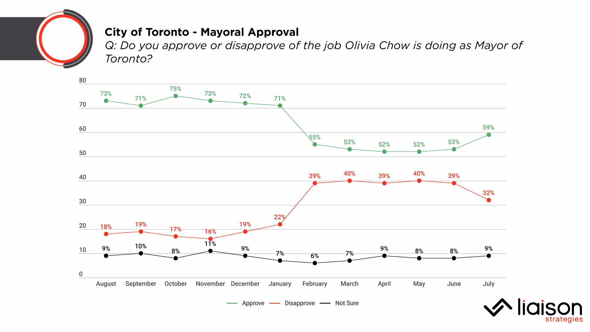 "Olivia Chow's approval is up 6 points to 59% and she leads Ana Bailao in a theoretical rematch by 19 points" said David Valentin, principal at Liaison Strategies. "On her one-year anniversary as mayor she looks secure at City Hall after a term full of tough decisions."