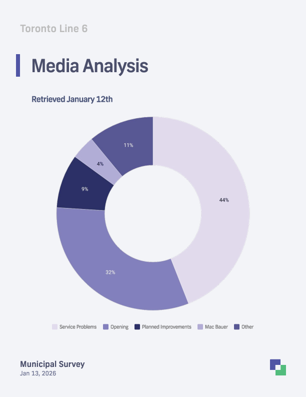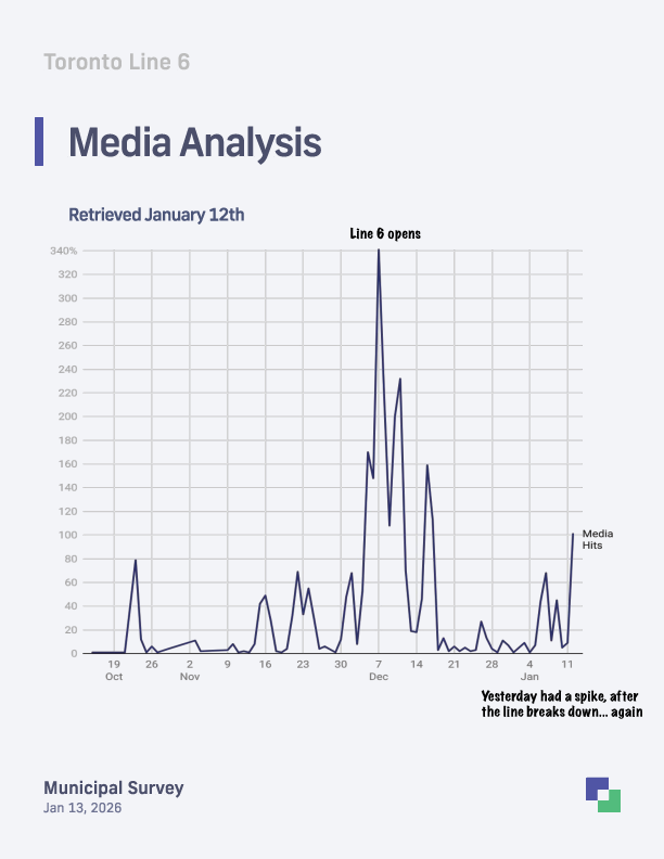 Line 6 Finch West officially entered service on December 7, 2025, operating between Finch West Station (Keele) and Humber College. In the weeks since, it has been a regular feature of local coverage, too often for the wrong reasons, with much of the attention focused on disruptions, delays, and technical issues that are clearly shaping how Torontonians are judging the rollout. Over the last 90 days, 44% of media coverage has centred on service problems, compared with 32% focused on the opening of the line.