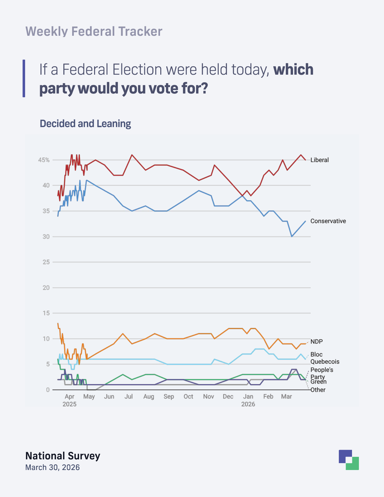 Liaison surveyed a random sample of 1,000 Canadians from March 16 to March 28, 2026, using Interactive Voice Recording (IVR) technology. To ensure a representative sample, participants were reached through random digit dialing (RDD) across both landline and cellular phone networks. Each week, the rolling survey refreshes the sample by adding 500 new participants and removing the oldest 500 participants. The margin of error is ±3.1 percentage points, 19 times out of 20.