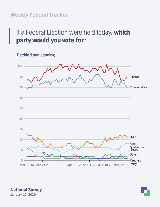 Liaison surveyed a random sample of 1,000 Canadians from January 5 to January 17, 2026, using Interactive Voice Recording (IVR) technology. To ensure a representative sample, participants were reached through random digit dialing (RDD) across both landline and cellular phone networks. Each week, the rolling survey refreshes the sample by adding 500 participants and removing 500. The margin of error is ±3.1 percentage points, 19 times out of 20.