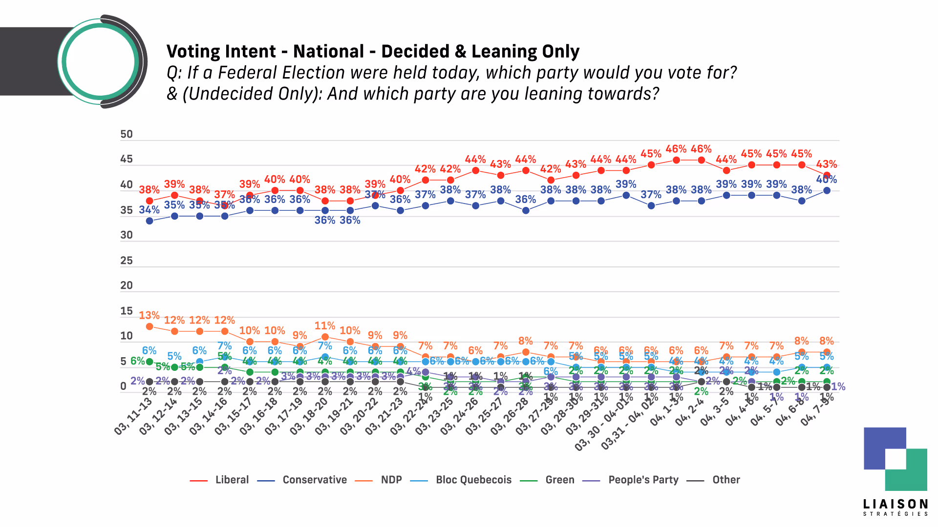 The rolling survey, conducted from April 7 to April 9, 2025, used interactive voice response technology to poll 1,500 Canadian voters. The results have a margin of error of +/- 2.53%, 19 times out of 20.