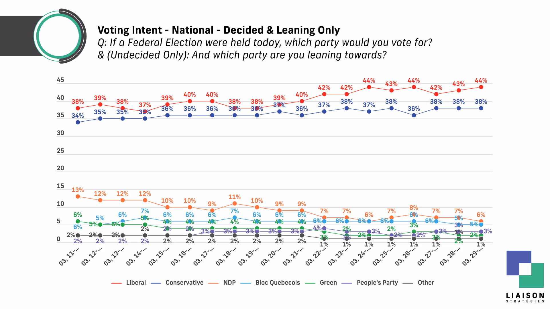 "It's no April Fool's joke—the Conservatives have now held steady at 38% for the third consecutive day," said David Valentin, Principal at Liaison Strategies. "Under normal circumstances, that might signal a path to a Conservative majority, but with the NDP and Bloc losing ground, the Liberals remain positioned as the likely winners if the election were held today."