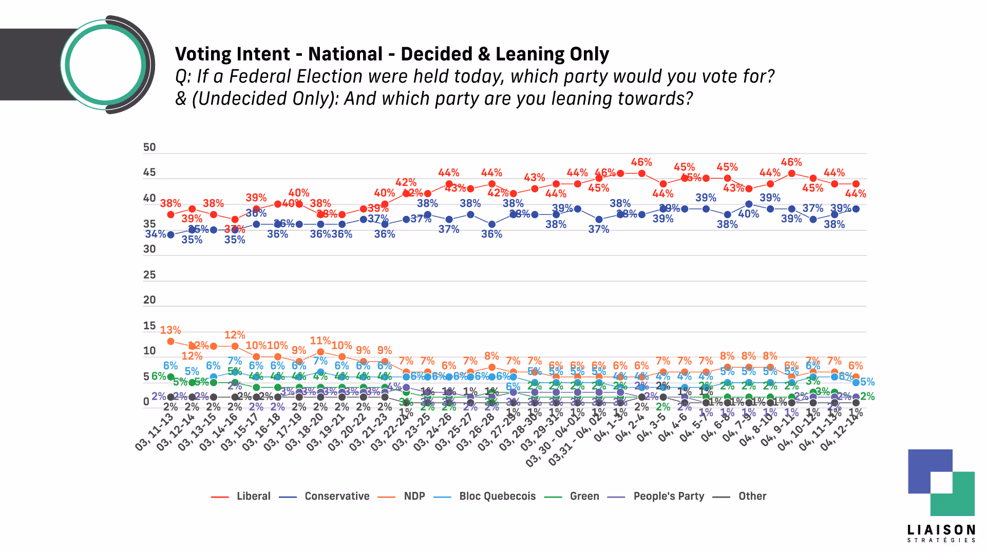 (Toronto, ON) – A new poll by Liaison Strategies for the National Ethnic Press and Media Council of Canada (NEPMCC), the industry association representing Canada’s non-official language newspapers, TV, radio, and online news media, finds the Liberals leading with 44% (no change) to the Conservatives 39% (+1).