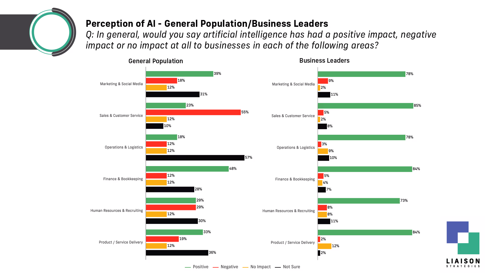 There’s also a Perception Chasm. Business leaders see AI as overwhelmingly positive, with up to 85% citing benefits, while the public is far more skeptical. A majority (55%) believe AI is hurting sales and customer service, and only finance earns modest support.