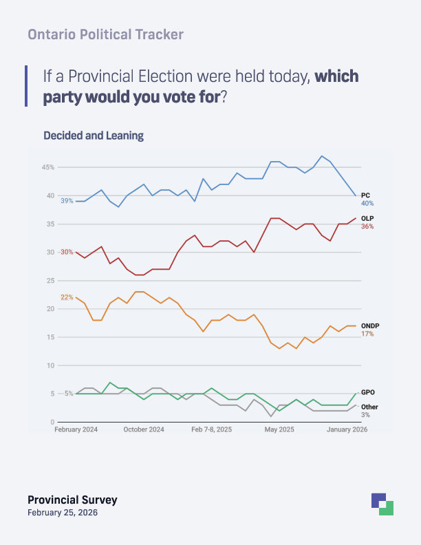"While the PCs maintain a four-point lead among decided voters, we are seeing a significant consolidation of the Liberal vote, particularly in key regions like the 416 and 905. In October the PCs were at 47% - now they are at 40%. Every month we have seen them shedding one or two points. If the trend continues, they will soon be tied with the Liberals or trailing."