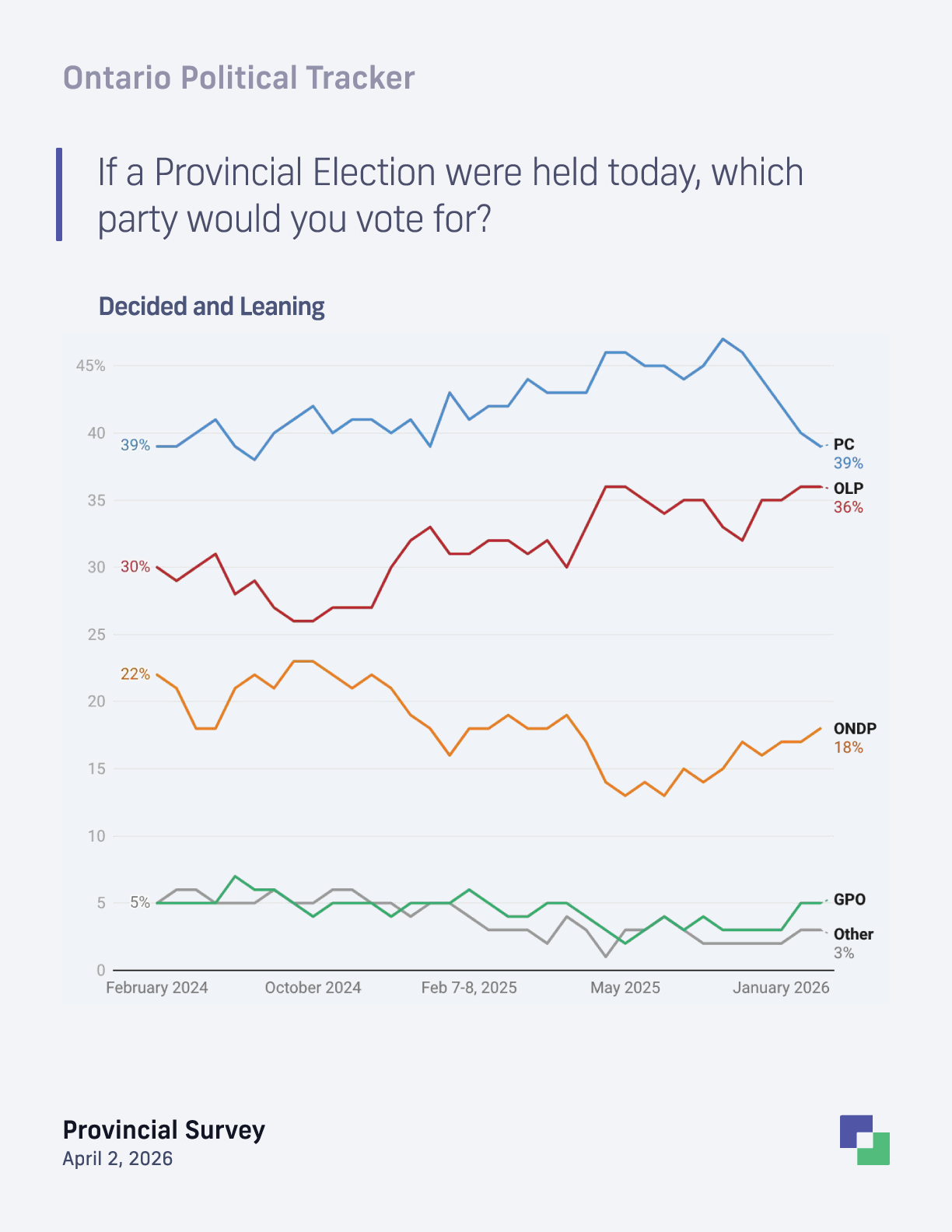 Liaison surveyed a random sample of 1,000 Ontarians from March 27-29, 2026, using Interactive Voice Recording (IVR) technology. To ensure a representative stratified sample, participants were reached through random digit dialing (RDD) across both landline and cellular phone networks.  For the total sample, the margin of error is ±3.1 percentage points, 19 times out of 20.