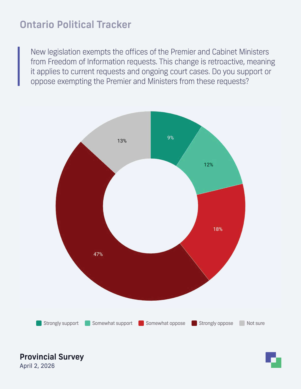 "65% of Ontarians oppose new legislation that retroactively exempts the offices of the Premier and Cabinet Ministers from Freedom of Information requests."