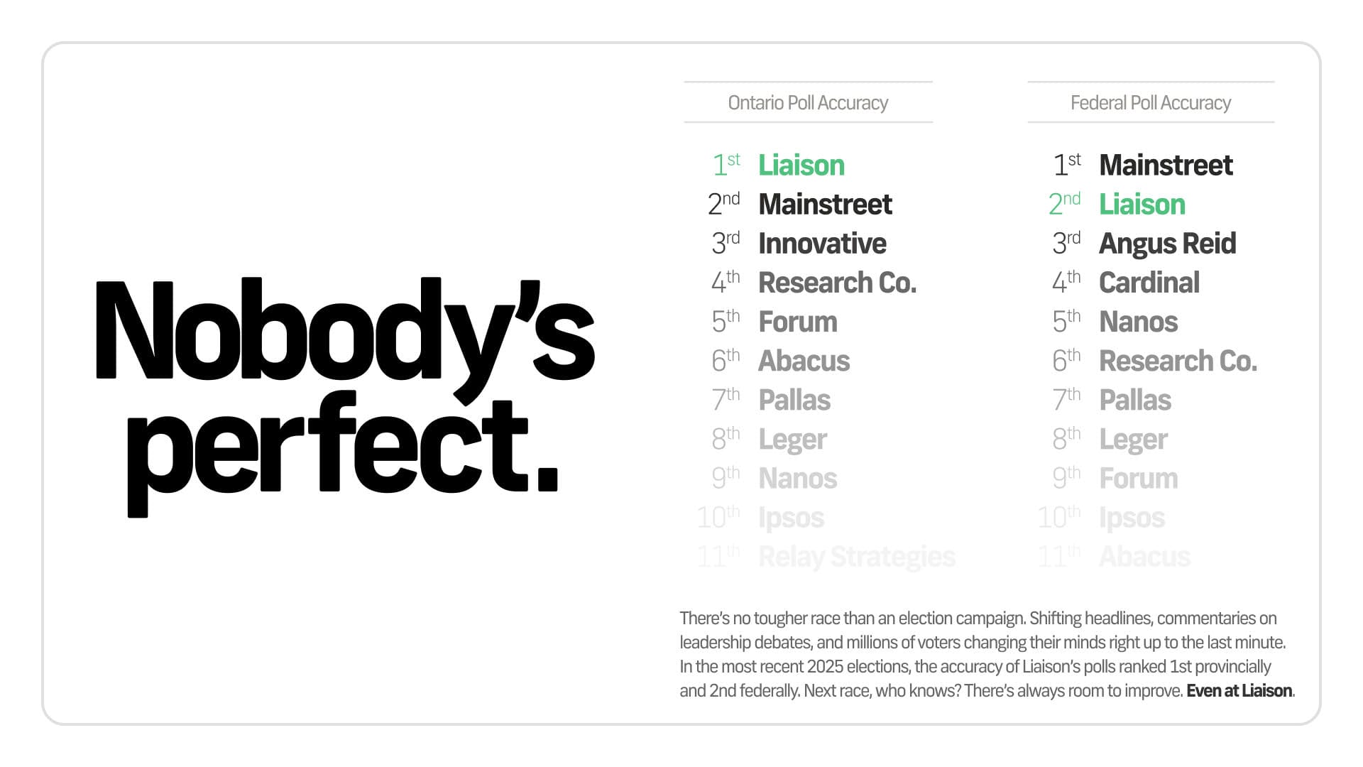 Liaison Strategies is one of the most accurate polling firms in Canada. It ranked #1 in accuracy in the 2025 Ontario election and #2 nationally in the 2025 federal election. Liaison is a member of the Canadian Research Insights Council (CRIC).