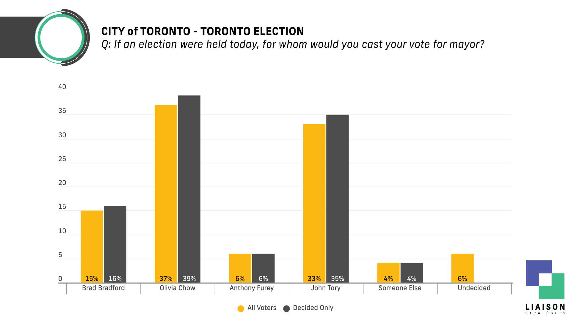 (Toronto, ON) – A new Liaison Strategies poll for the National Ethnic Press and Media Council of Canada (NEPMCC) finds Toronto mayor Olivia Chow leading in a potential re-match with former Toronto mayor John Tory, 39% to 35%. Brad Bradford, the first candidate to declare their intention to run for mayor, follows in third with 16% (+4).