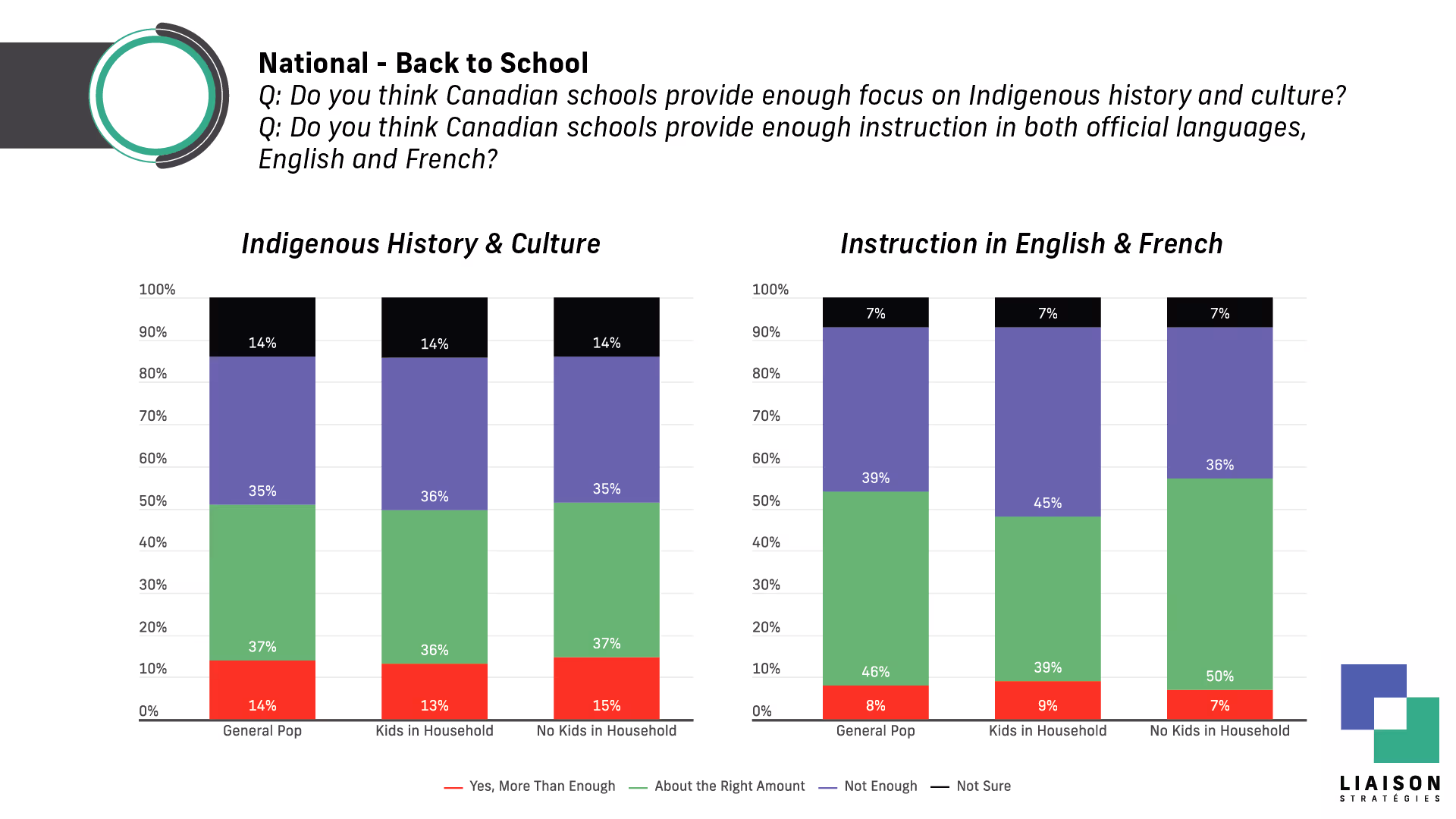 "Canadians are also looking for balance in the curriculum: pluralities say the focus on Indigenous history and official languages is about right, but 39% of Canadians say they want more instruction in both English and French - with that number rising to 45% among parents."