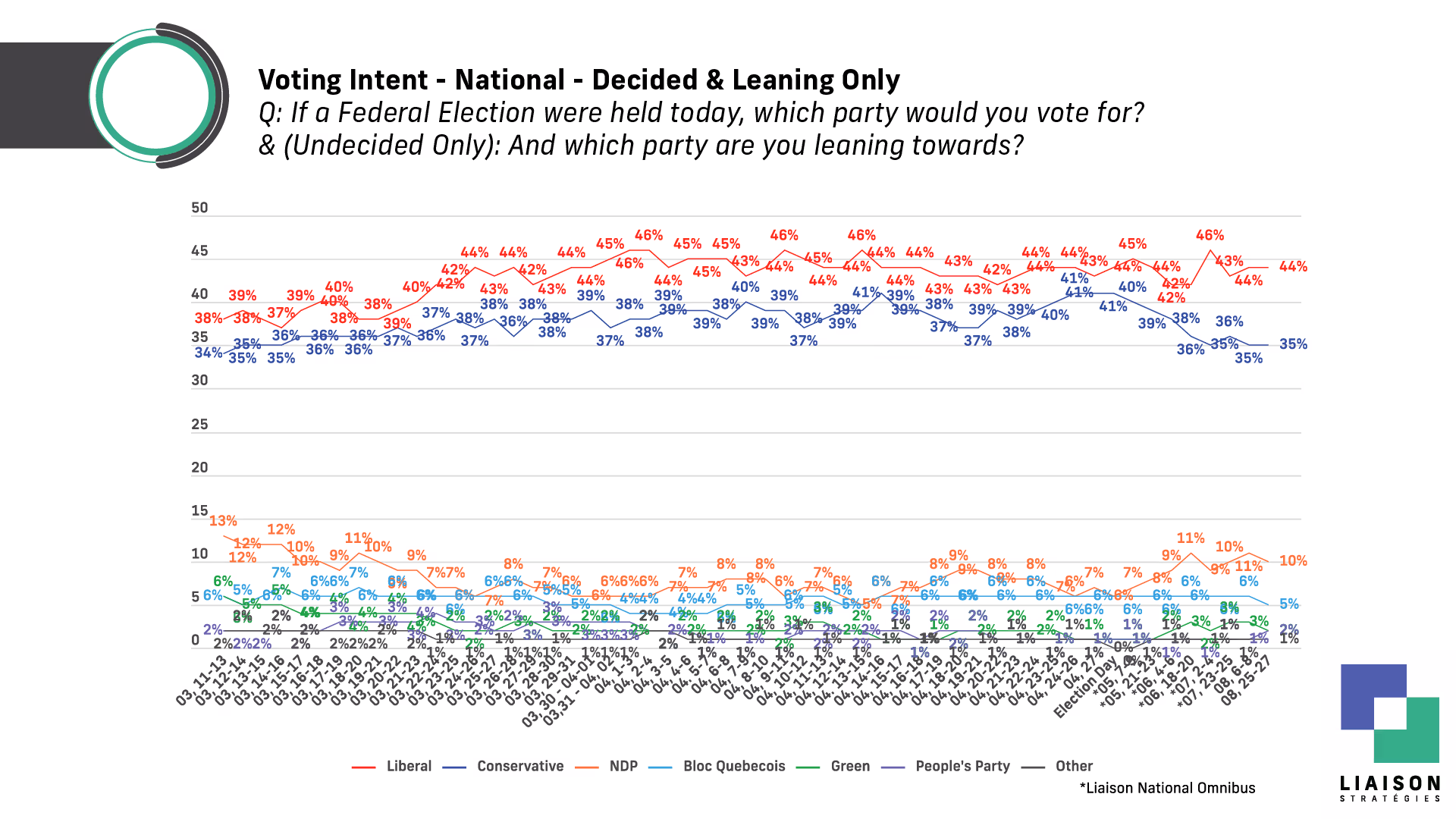 Mark Carney's Liberals continue to post strong numbers as they head into the fall. While the budget may yet upped their strong national lead, or solidify it, they have a strong 9-point lead over the Conservatives.
