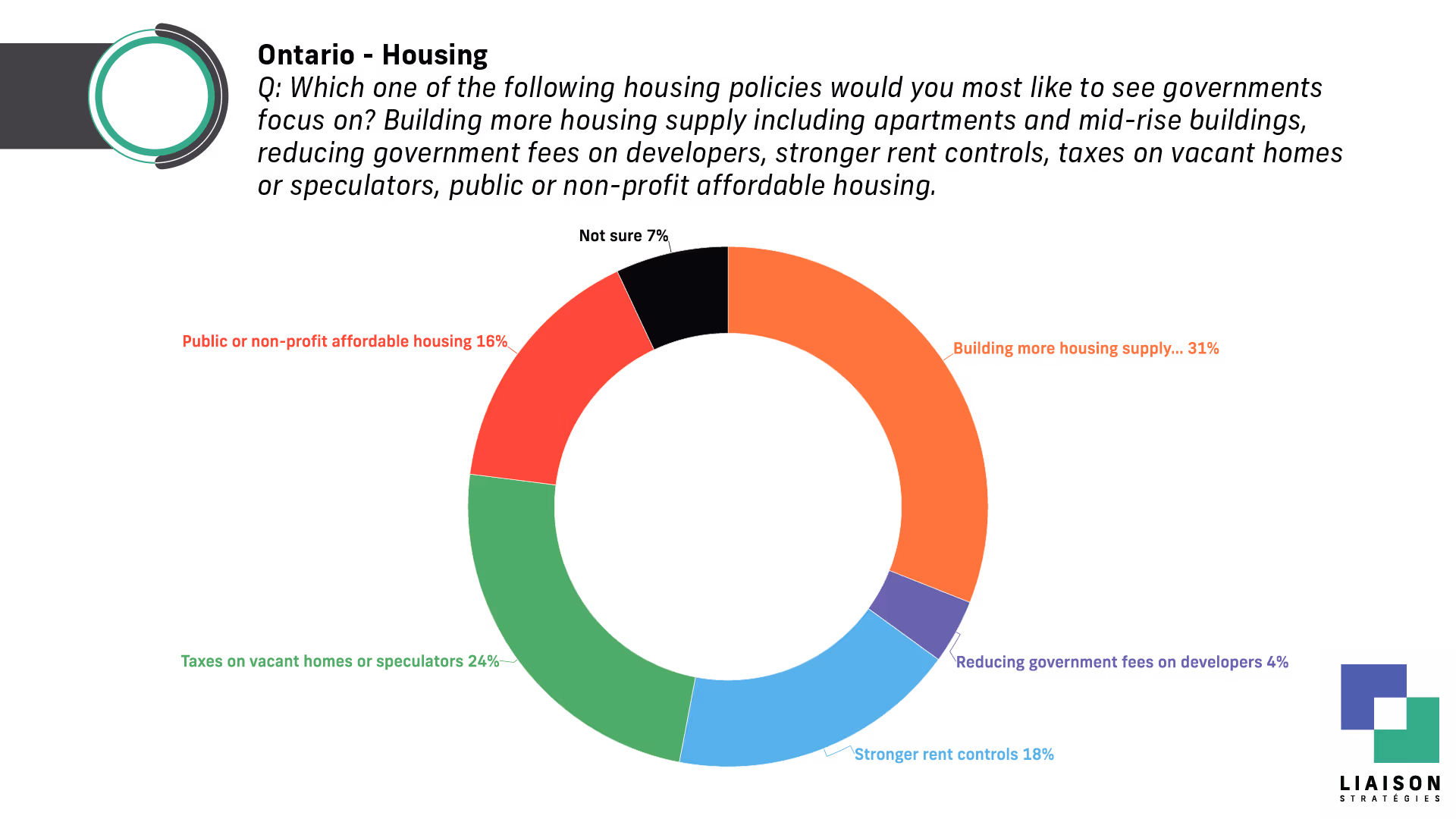 (Toronto, ON) – A new Liaison Strategies survey of 800 Ontarians shows the province is deeply divided on housing, with sharp contrasts over what drives costs and what governments should do. The poll also finds the Ontario PCs leading the Ontario Liberals by nine points if an election were held today.
